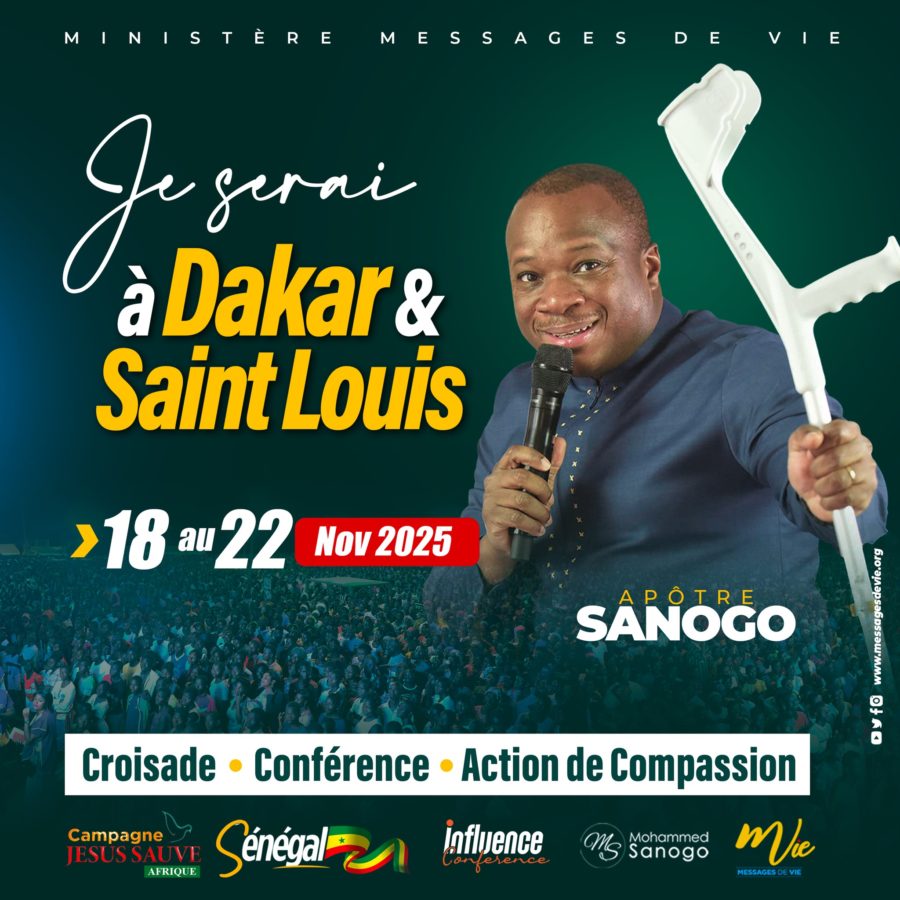 Depuis plus de 25 ans, le Ministère Messages de Vie et L’apôtre Mohammed Sanogo parcourent les nations pour démontrer l’amour de Christ à travers de puissants actes de compassion qui transforment des vies. Du 18 au 22 novembre 2025, Cap sur le Sénégal pour encore manifesté l’amour de Christ à travers cette grande campagne d’évangélisation et d’action sociale. Alors, joins-toi à nous par tes prières & tes dons.